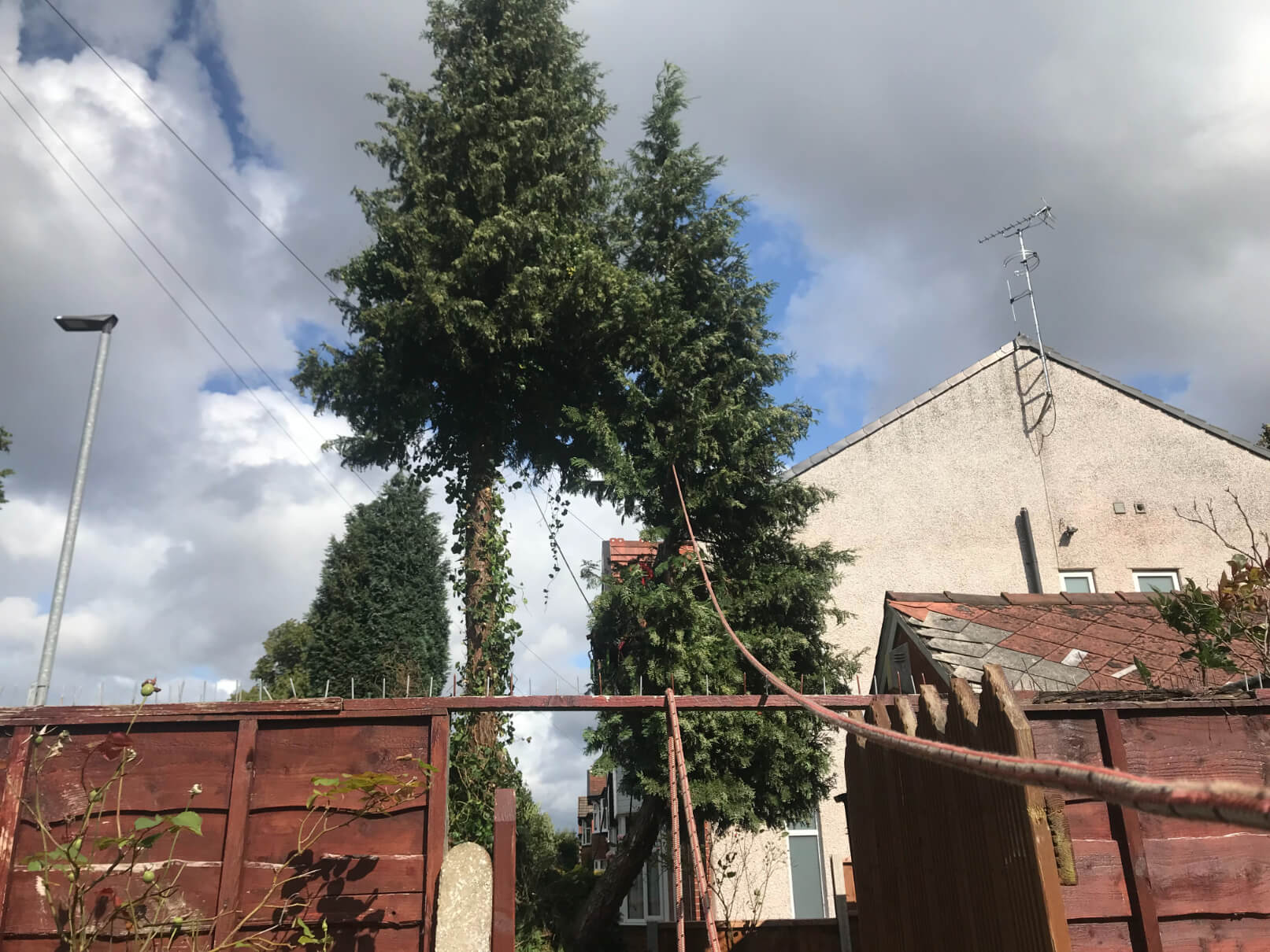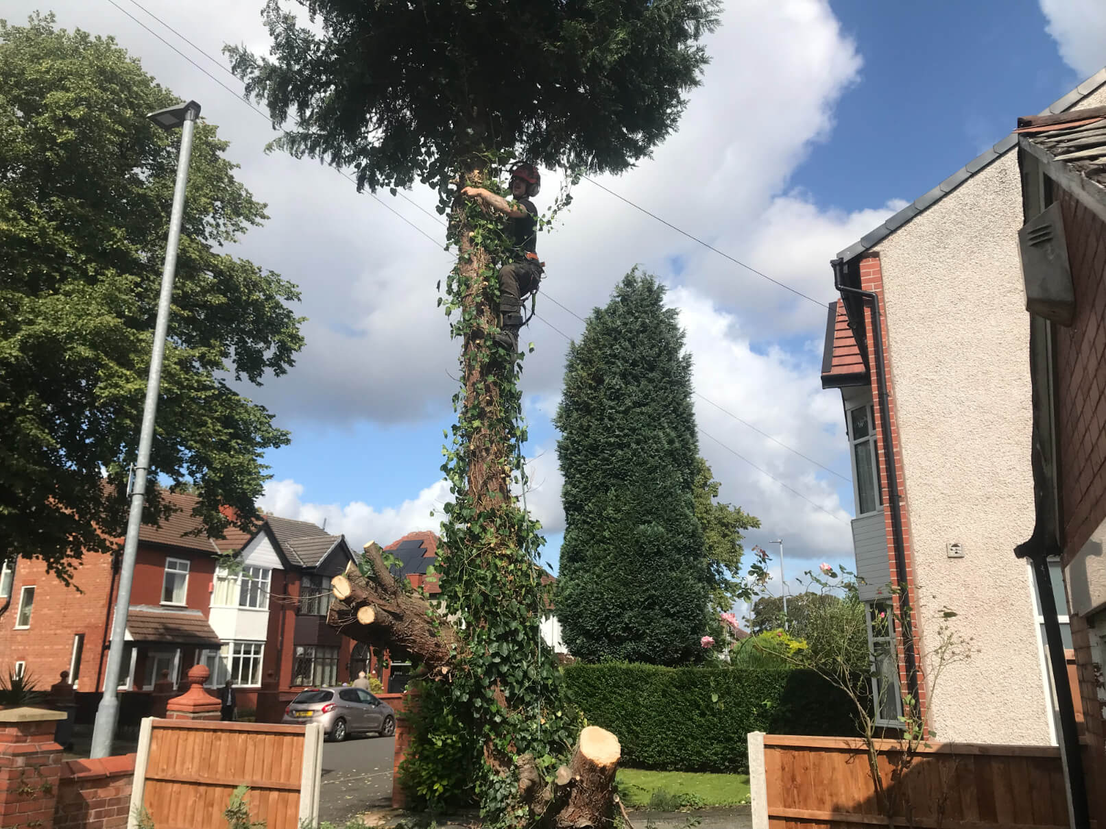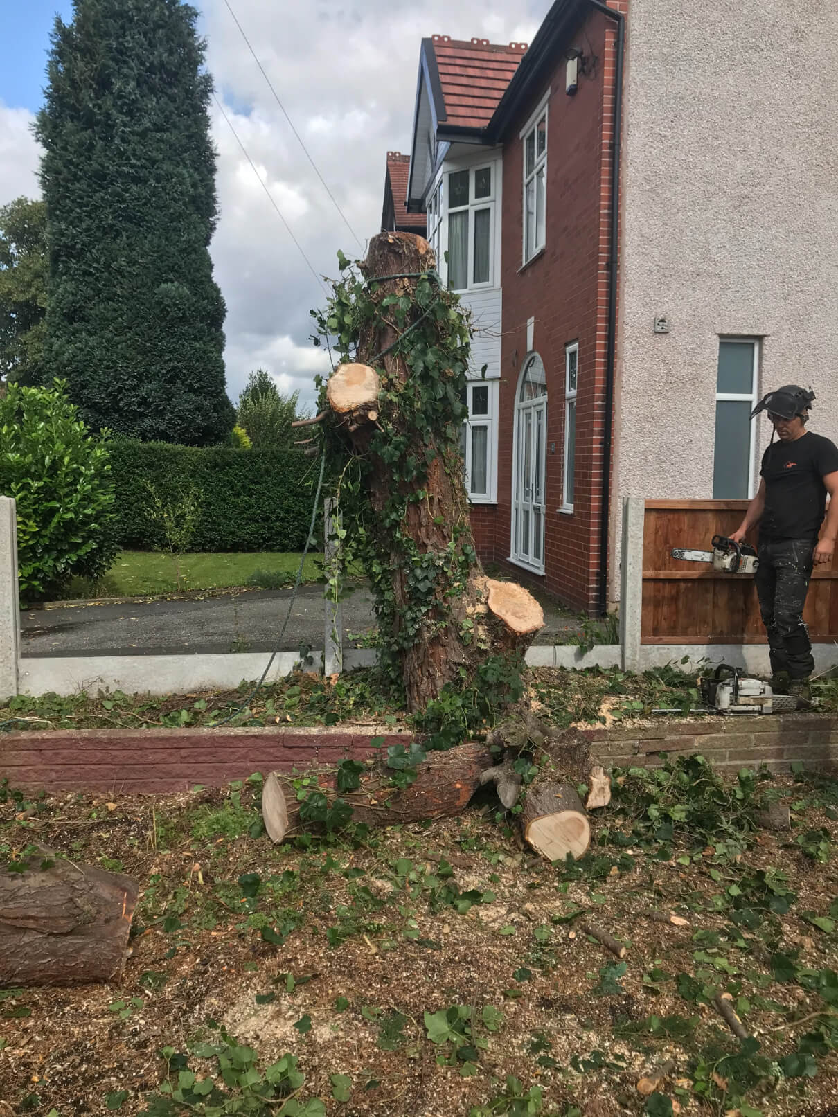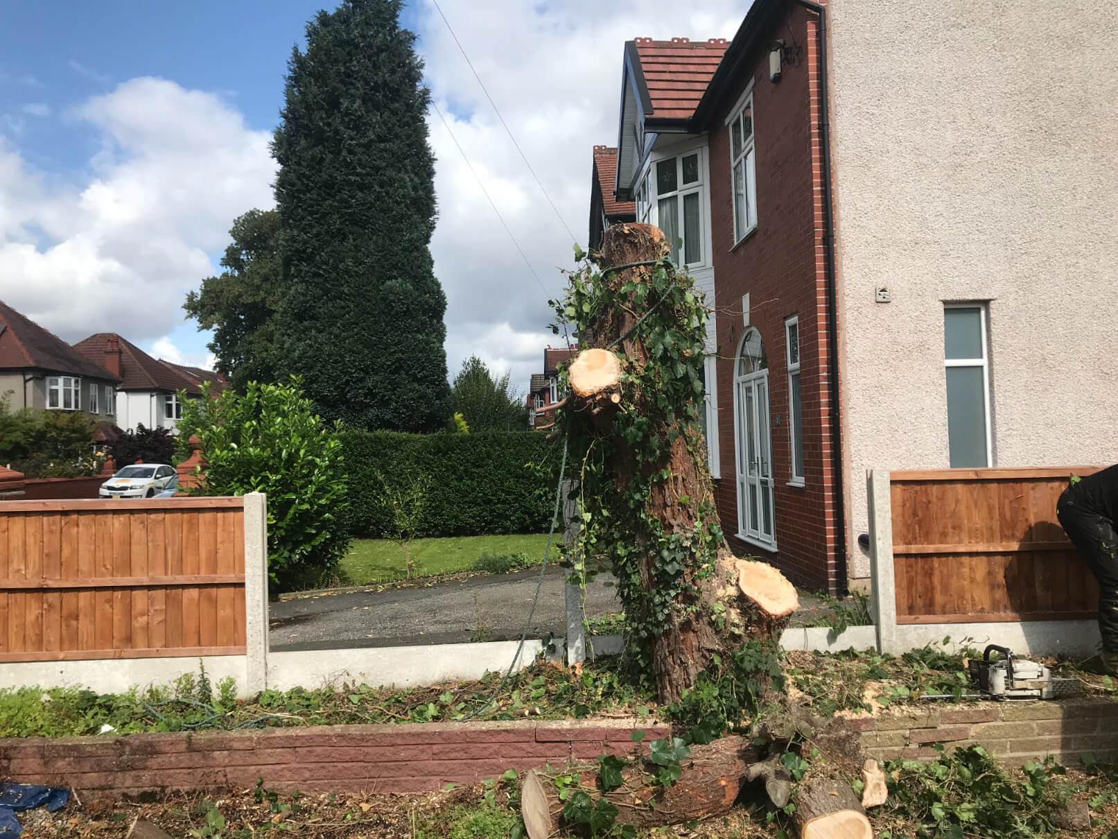 We cut the tree down to a stump. As this was a tight spot and tree was right between the fence and little brick wall, plus a garage was right near it, we were allowed to take two fence panels out and used sectional tree removal techniques. Like always, we care for the safety of the property therefore we use utmost carefulness to properly cut the tree down.
