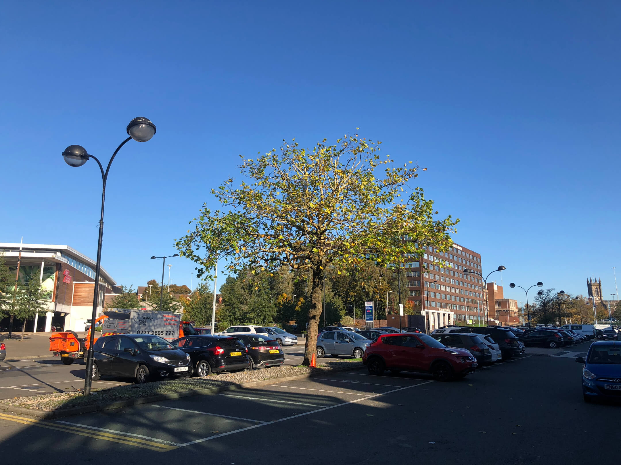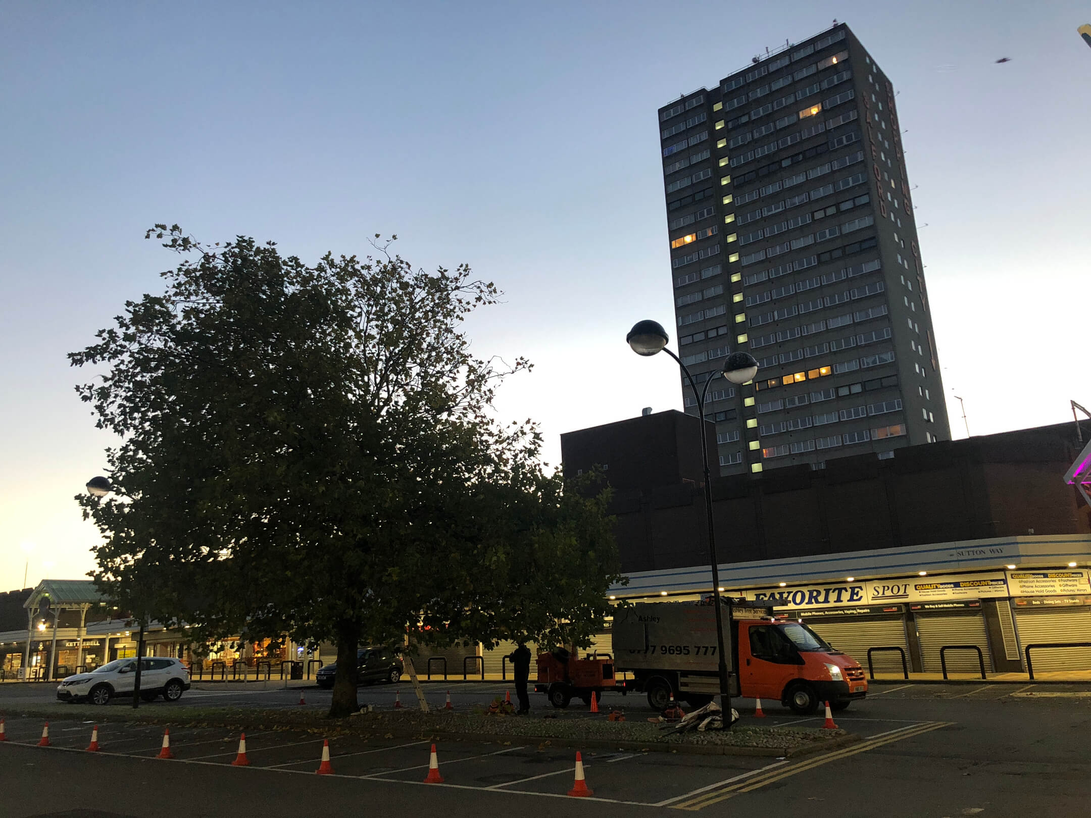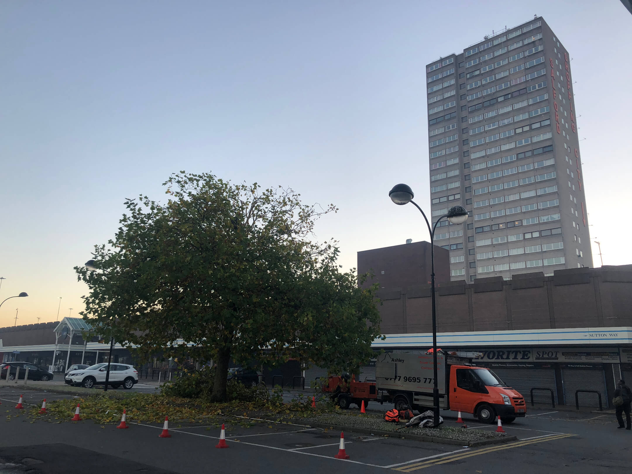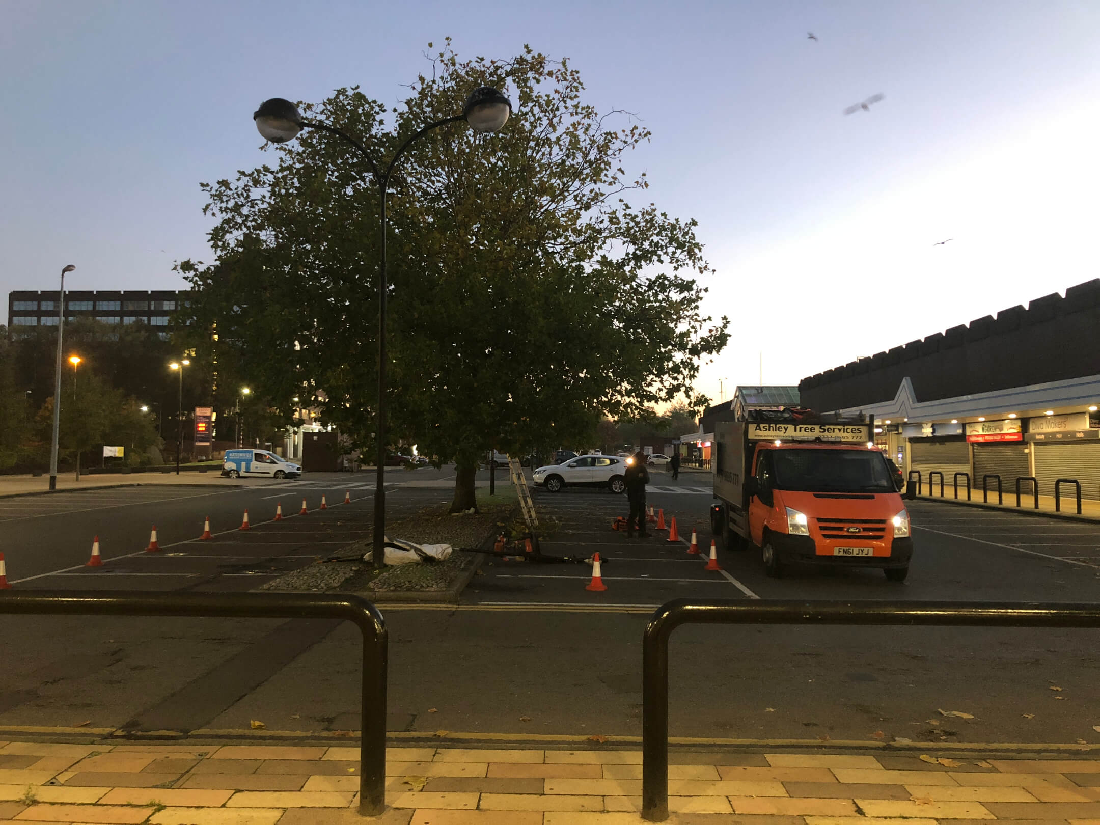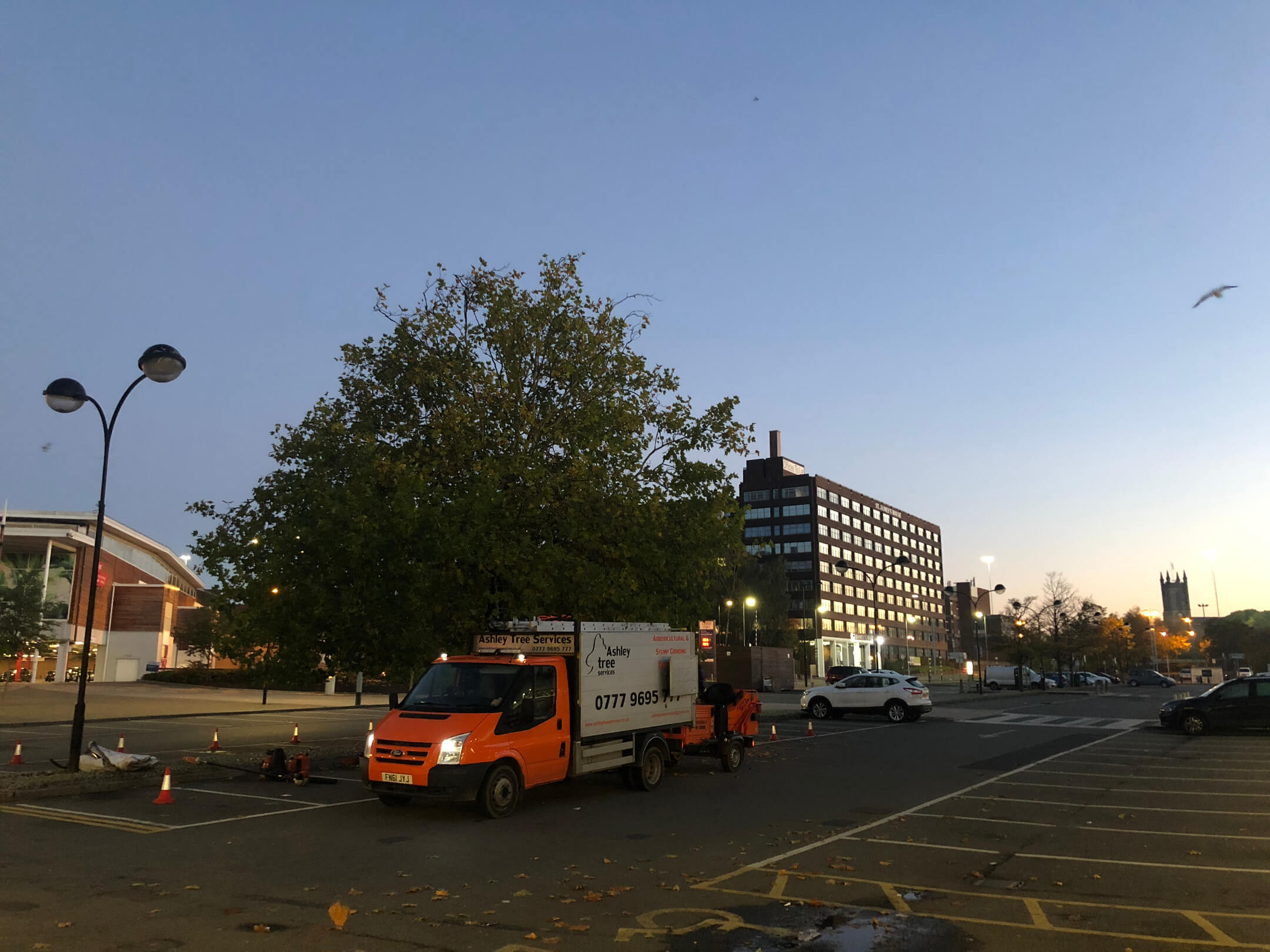 Ashley Tree Services doing a crown reduction job in Salford, for Salford Shopping Centre.