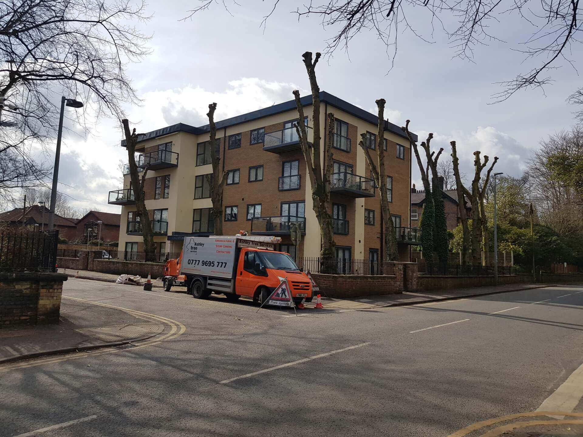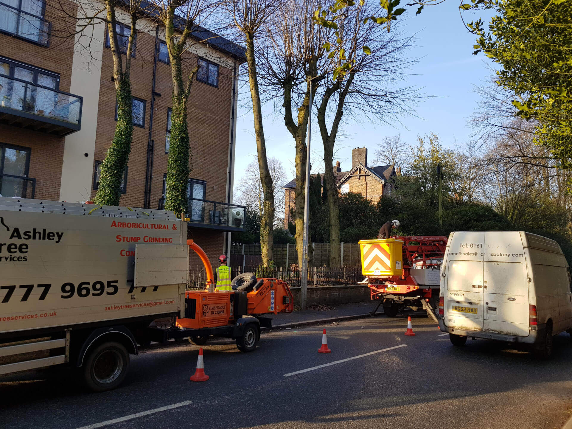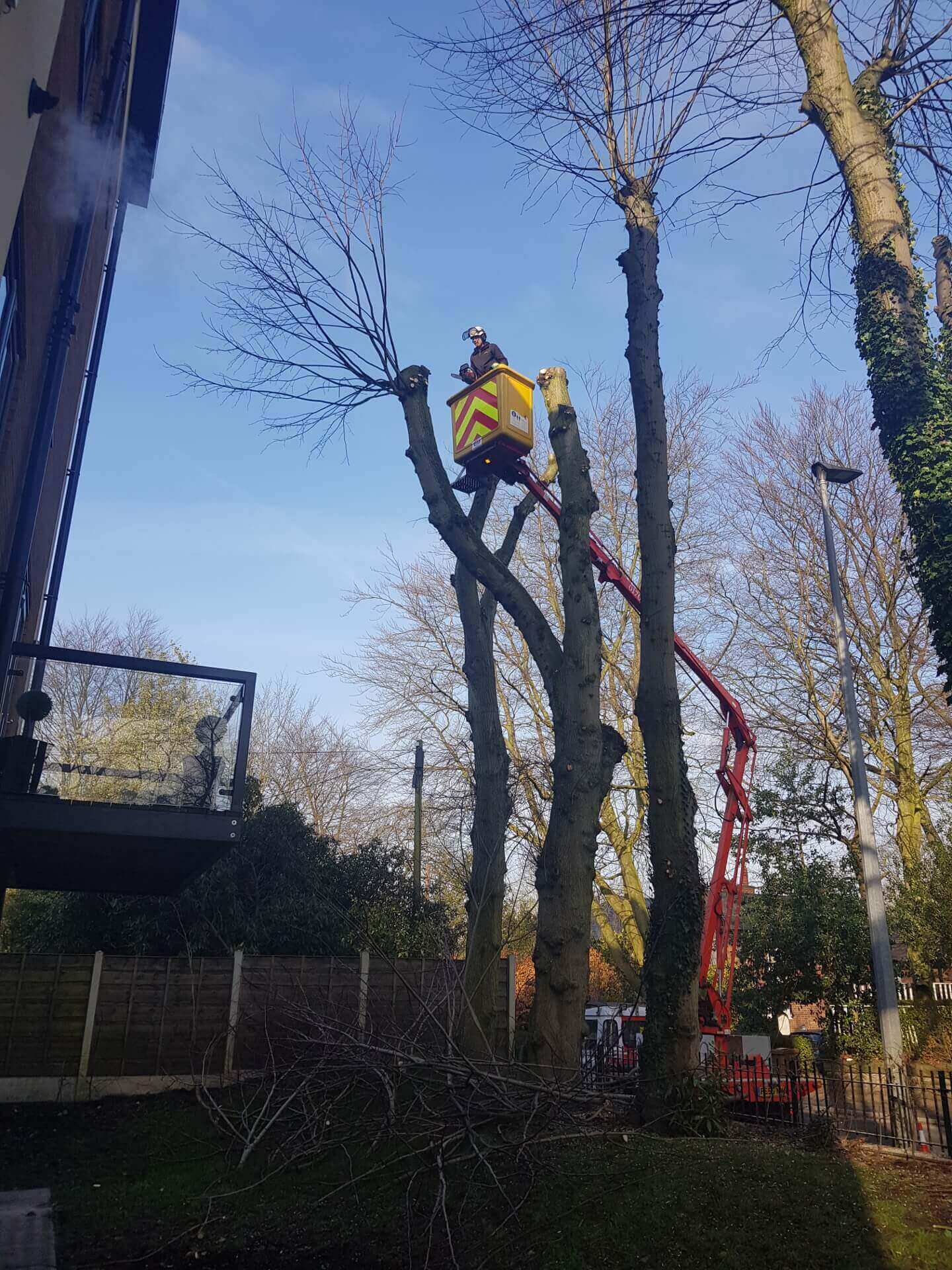 Ashley Tree Services pollarding multiple Lime trees in Prestwich, Manchester.