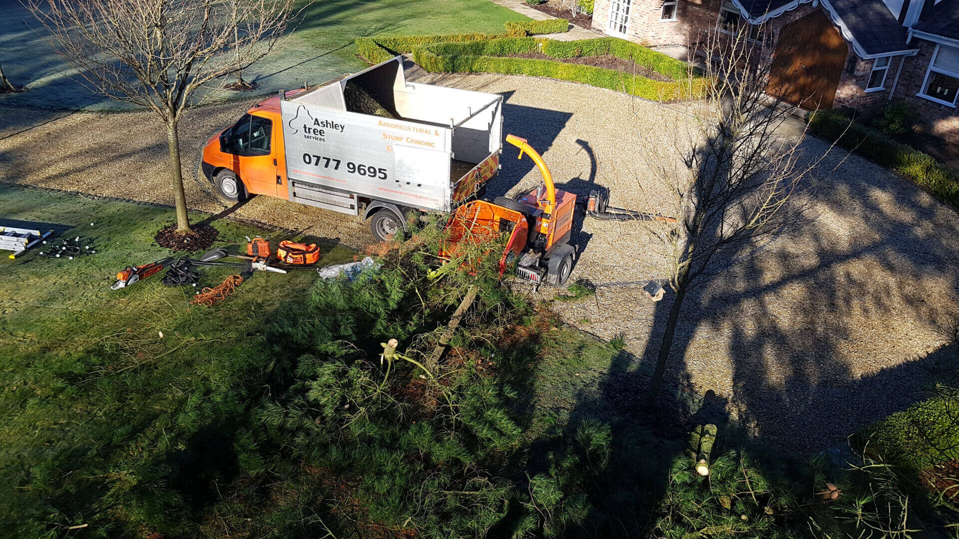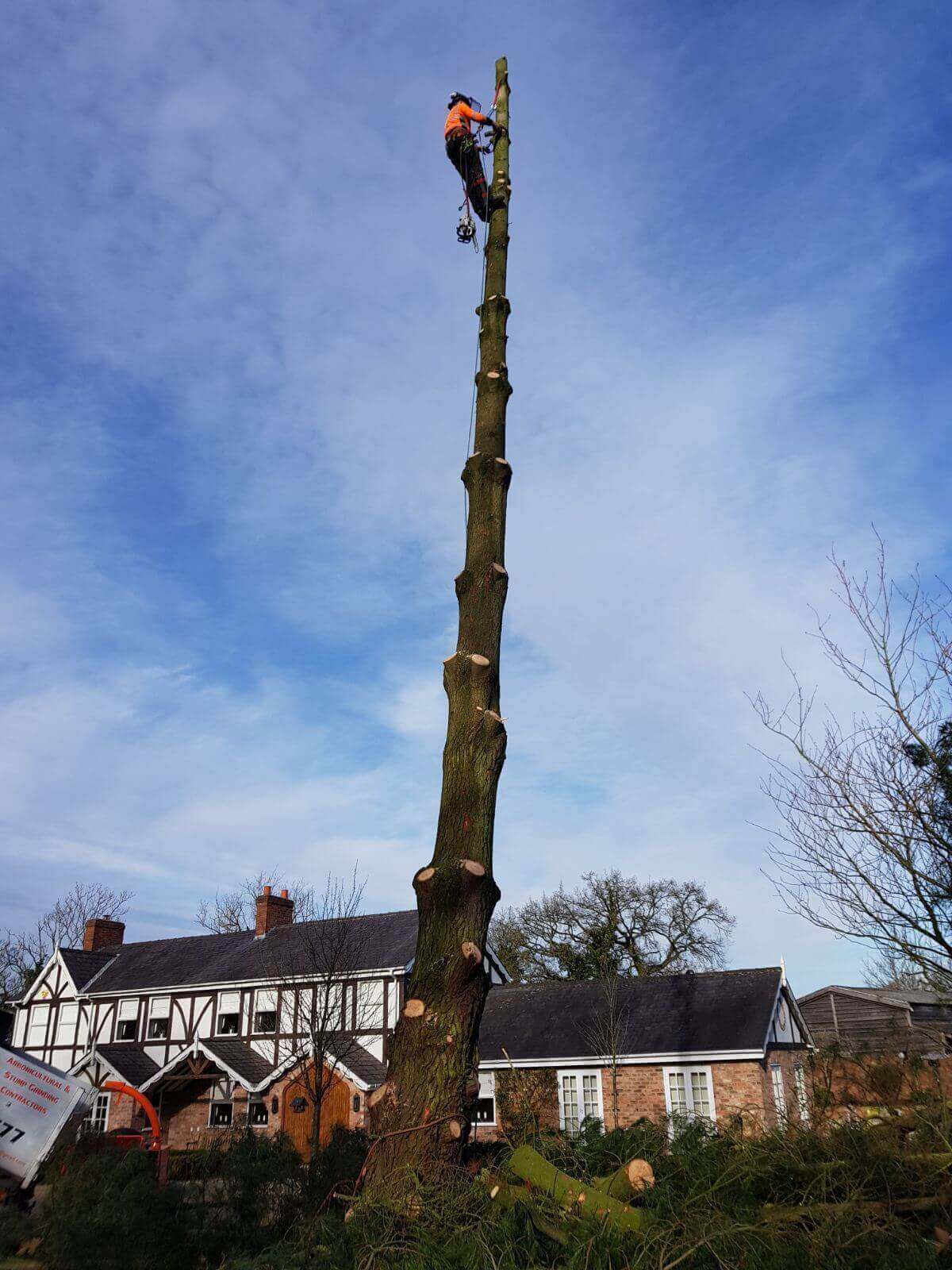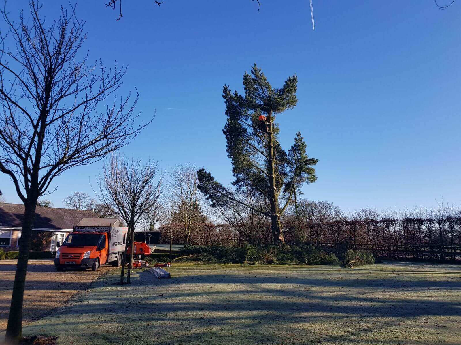 Ashley Tree Services received a call from Mobberley, Cheshire with a quote request for felling a large pine tree and removing stump for future landscaping and leaving no trace of root system.